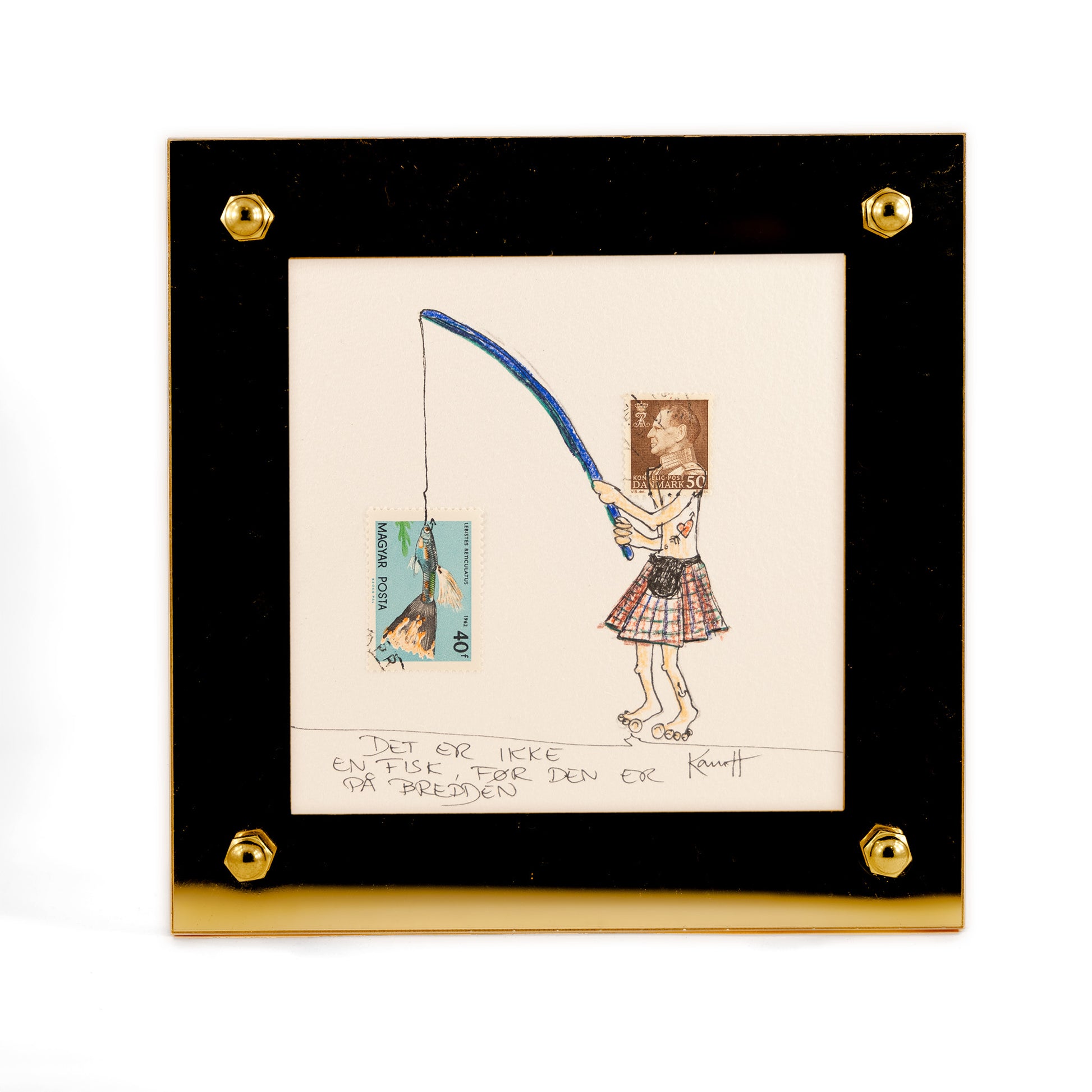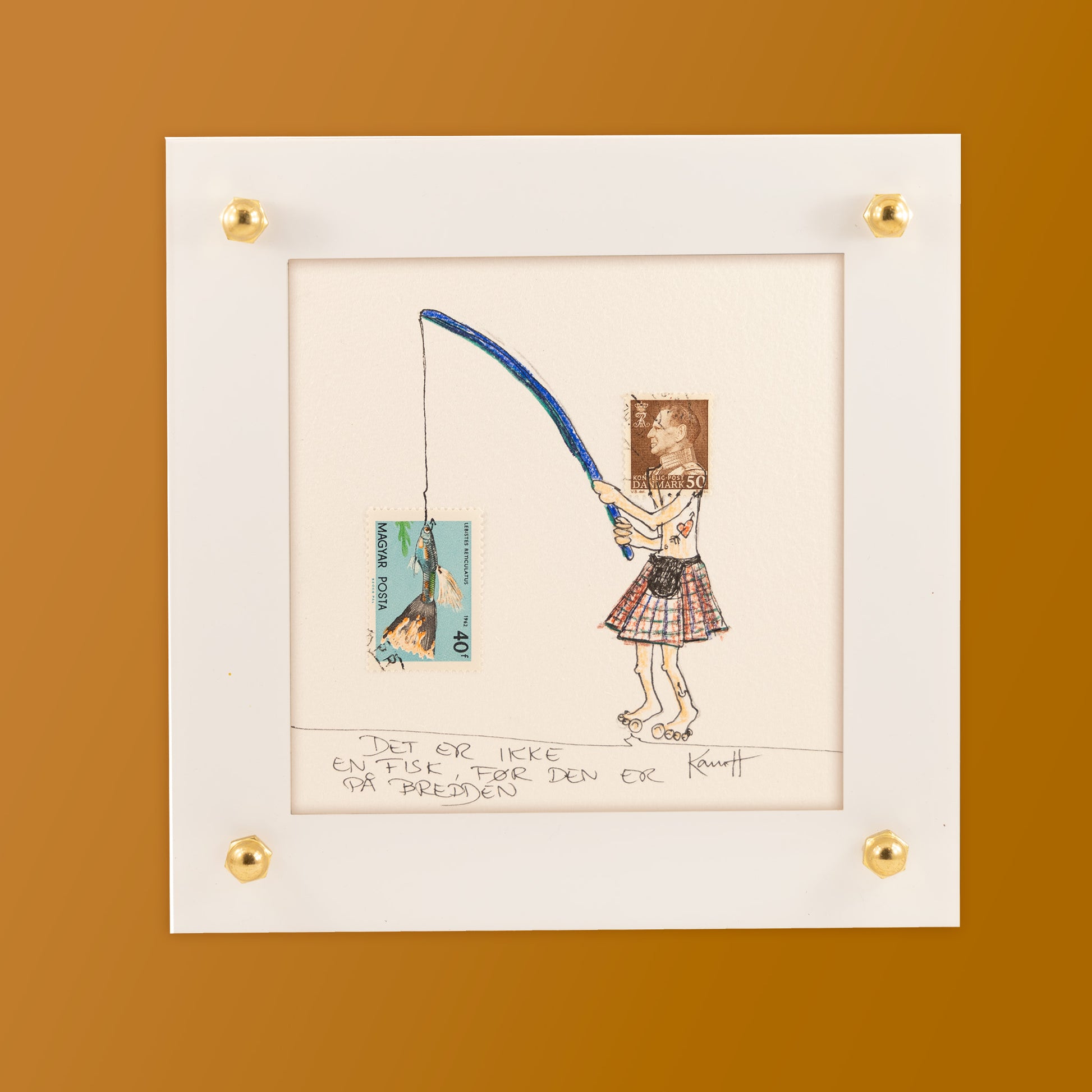 Unik tegning. Frimærke, tusch og farveblyant på papir.